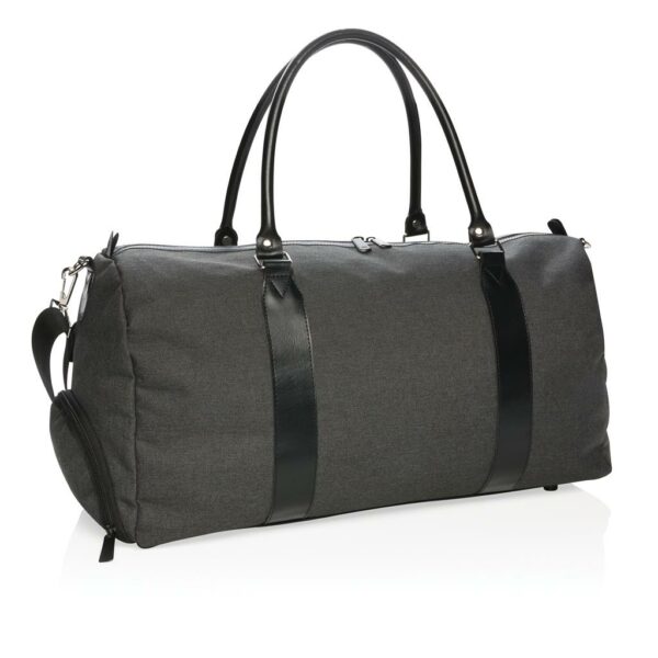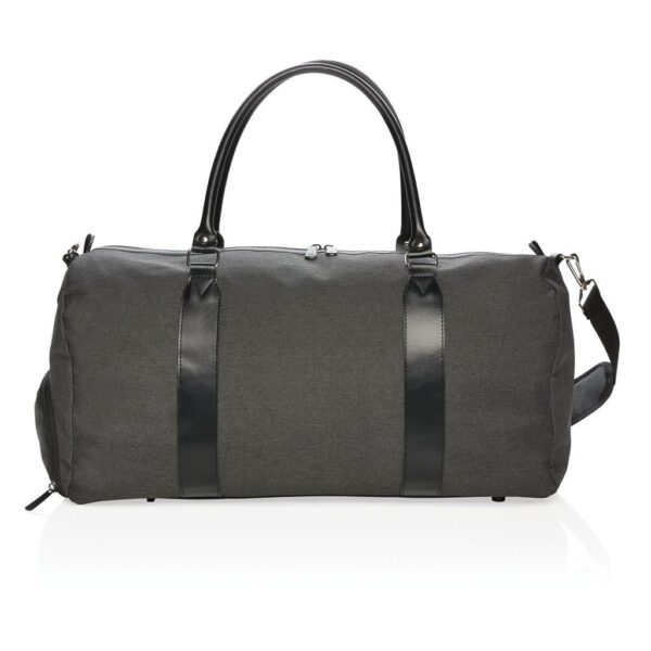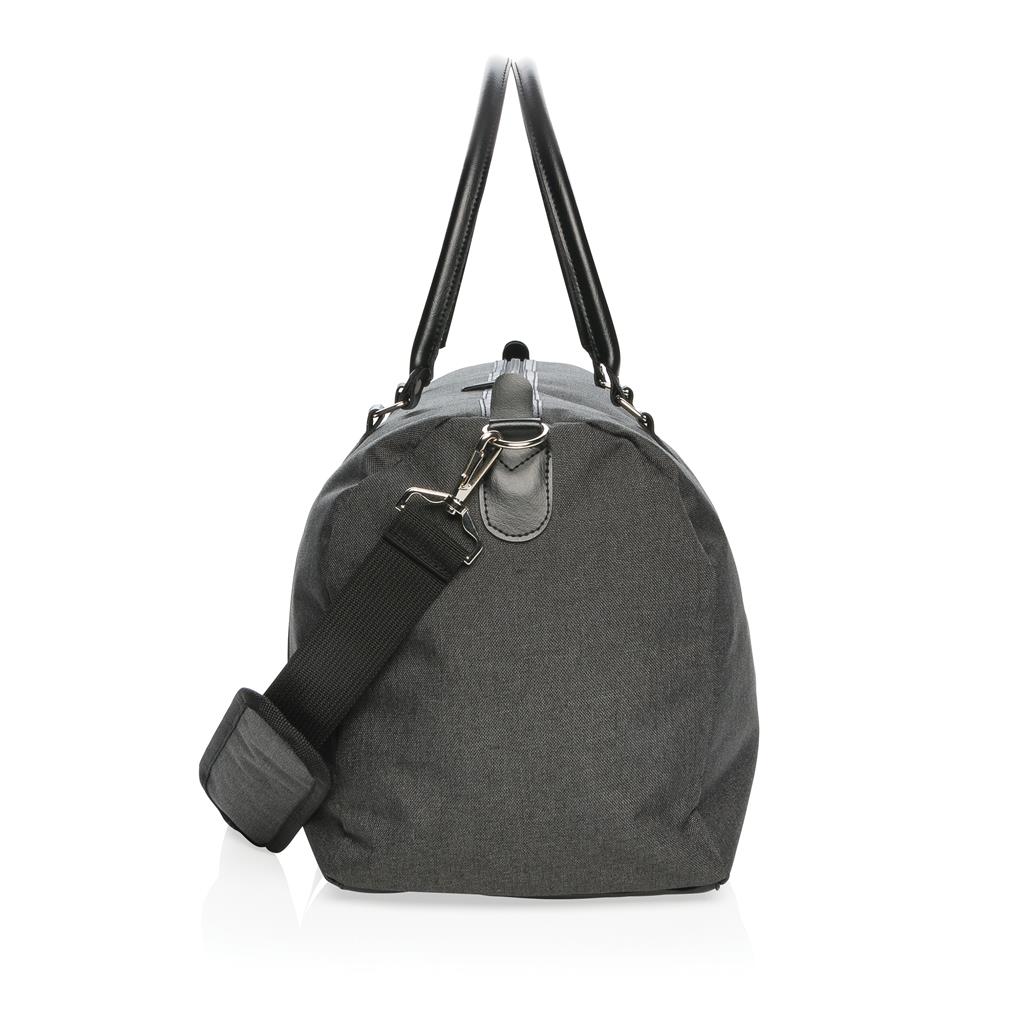 Sac weekend 600D au design moderne et minimaliste avec poignées en PU et bandoulière confortable. Grand compartiment principal avec beaucoup d’espace. Connectez votre powerbank (non inclus) sur le port de chargement USB intégré et chargez votre téléphone ou tablette sur le trajet. Sans PVC.